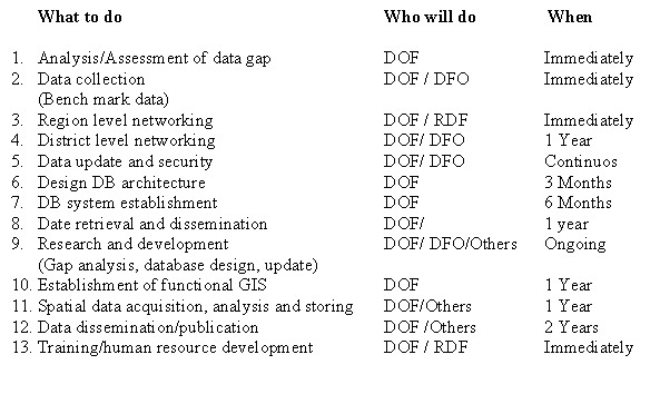 An Intranet communication will be made between the forest department and 5 Regional Forestry Offices through dial up networking. At the moment, there are PCs and modems available in 5 Regional Forestry Offices in 5 development regions (Fig 1) and only few districts (about 12) have PC but more than 70 district offices have telephone connection. The service will be gradually expanded to district forest offices that will have PC units and telephone connection. This way collection of data and sharing among the stakeholders will be made easy in coming years in the future.