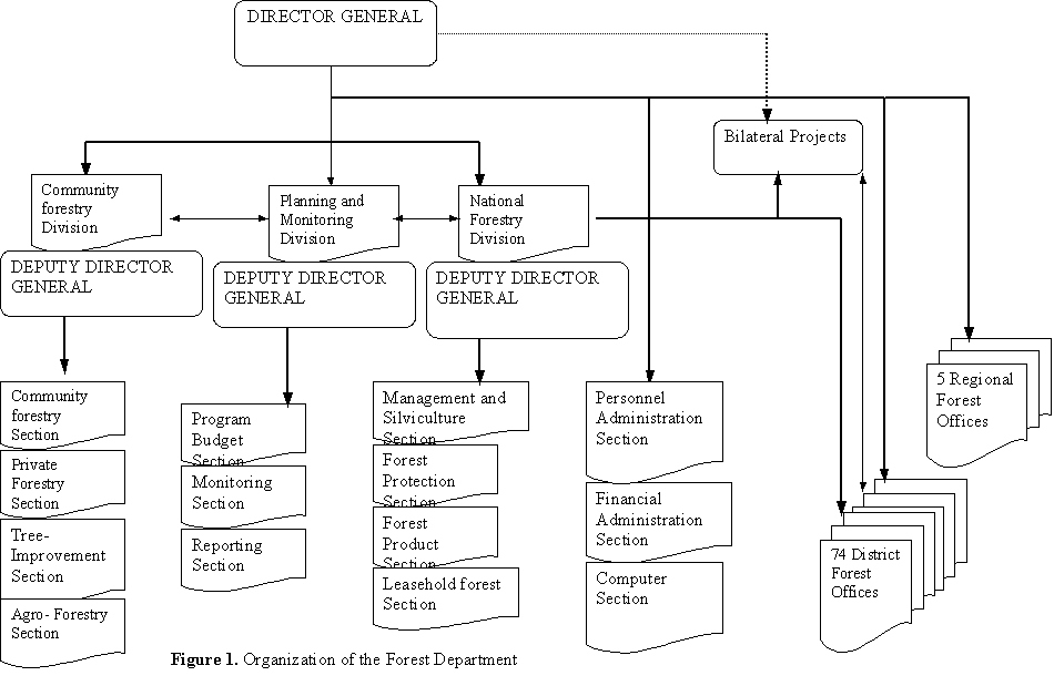 Department of Forest has three main divisions. Each division is independent in terms of their functioning under the over all supervision of the Director General. The Department mainly takes care of field implementation of development programs. The organization chart of forest Department is in figure 1.