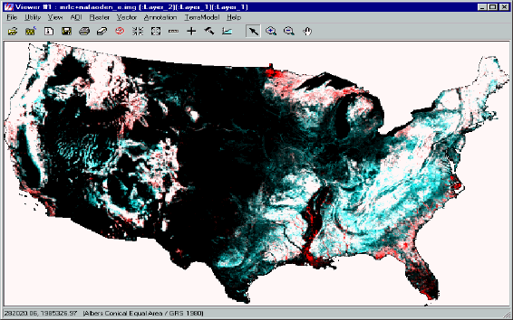 Figure 3. Comparison of FRA2000 forest canopy density (displayed in red in the RGB composite) with MRLC derived forest canopy density (displayed in green and blue in the RGB composite) in the conterminous U.S. The MRLC map was derived by recoding the three forested classes (see Appendix 1 for MRLC classes) to forest and the rest of the classes to nonforest, and then aggregating 30-meter pixels to corresponding 1 km pixels. Areas of agreement by the two maps are in shades from black to white depending on estimated canopy density. Areas of red show the FRA2000 map as more forested and the MRLC map as less forested, whereas shades of cyan indicate the MRLC map as more forested and the FRA2000 map as less forested.