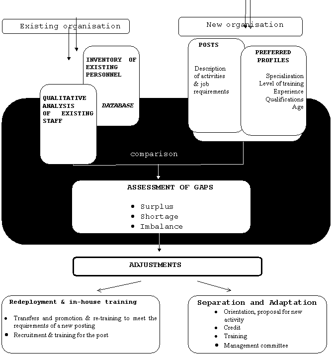 The implications for staff are defined in comparison to the results of analysis and evaluation of existing staff carried out in the first stage, along with staff requirements as defined on the basis of job descriptions in the second stage.