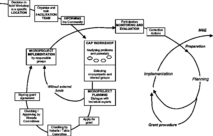 The long term vision underpinning the CAP process is that eventually community groups might also directly plan micro projects and, if needed, seek technical or financial assistance through the Kebelle/Tabia Committee to the Woreda Coordinating Committee, without having to wait for the next organised CAP workshop to initiate the planning process. This is especially true of income-generating activities which are ultimately individual or small group initiatives and microprojects are more about obtaining the necessary knowledge and skills.