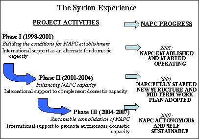 Project GCP/SYR/006/ITA has been implemented over three phases corresponding to successive stages of the capacity and institutional development process focused on the NAPC, as summarised in Box 1:
