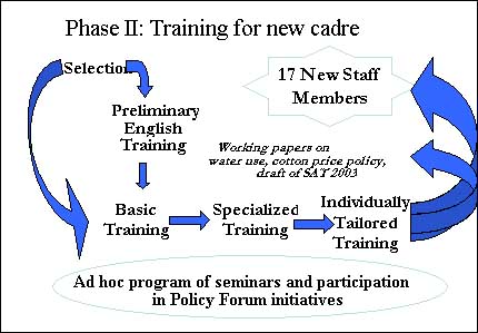 Training represented a major activity under the first two phases of the project (see Boxes 4 and 5). It was developed in three stages comprising basic, specialized and individually tailored phases, and was accompanied by complementary activities aiming at enriching trainees' background and their perception of the articulation of the agricultural economics and policy analysis field as well as at complementing training with hands-on participation in policy analysis activities promoted by the Project.