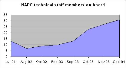 At the end of the second phase of the Project, the "nursing phase" of NAPC development can be considered completed. Indeed, staffing has reached the planned level, as can be seen from Box 12 while a Mid Term Work Plan for the period 2004-2007 has been adopted together with a new organizational structure designed thanks to the institutional support provided by the Project based on the experience gained during the previous years. The new organization will be adopted on experimental basis in the second part of 2004, when the staff currently abroad will be able to assume their duties in the NAPC
