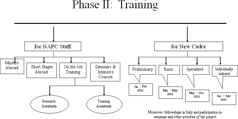 Phase II of the Project also made a substantial investment in training as can be seen from Boxes 10 and 11. In addition to the training of new cadres organized on the same line of the programme delivered during the previous phase of the Project, substantial investment was made in enhancing NAPC staff capacities. The latter included post graduate training in the USA for 4 staff members, short stages abroad for all other staff members, internal (staff-to-staff) seminars, one-week courses, seminars, language training, flash courses, research and training assistantships, on-the-job training.