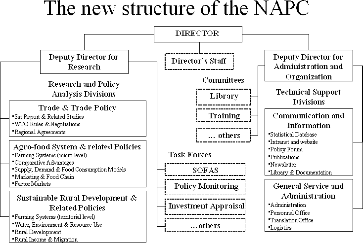 As a first step in Institutional Development, during Phase I, the Project prepared two studies with the support of international consultants, proposing options for reorganizing the structure of the Ministry of Agriculture and Agrarian Reform (MAAR) and providing the background to the establishment of a specialized institution in applied economic analysis of agricultural policies, the National Agricultural Policy Center (NAPC). A structure was devised for this new organization, as shown in Box 2.