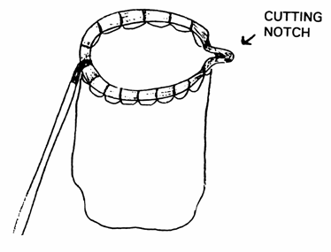 Picking poles and catching sacks can be made by hand or purchased from horticultural supply companies. The collection bags illustrated below were hand woven from strong cord or sewn from canvas. The hoop used as the basket rim and cutting edges can be fashioned from sheet metal, steel tubing or recycled scrap metal.