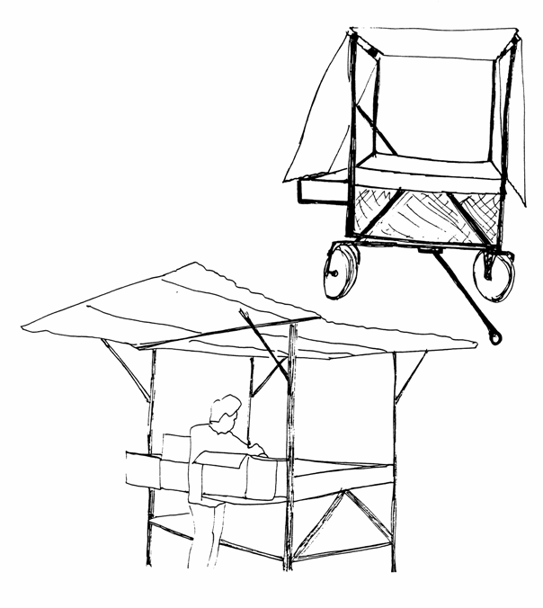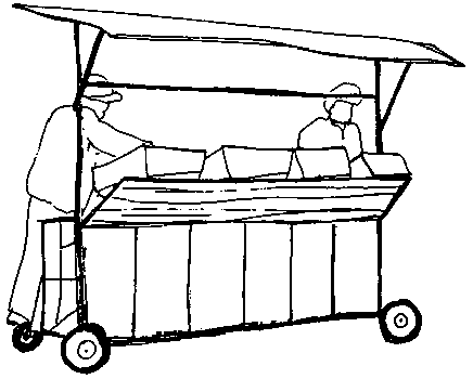 A simple aid for field packers is a movable cart with a rack for boxes and a wide roof to provide shade. This small cart is designed to be pushed by hand along the outer edge of the field or orchard where harvest is taking place. It has been used to field pack table grapes, small fruits and specialty vegetables.