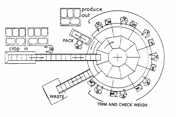 A circular rotating table can be used to pack a variety of crops. The produce is fed in along a conveyor or if no conveyor is in use, simply put onto the table, where packers select the produce and fill cartons at their stations. In the illustration below, a discard belt has been added below the supply belt, allowing easy disposal of culls.