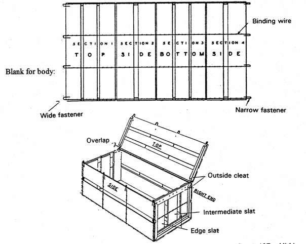 Containers can be constructed from wood and wire, using the general diagrams provided below. A special closing tool makes bending the wire loops on the crate's lid easier for packers to do. Wire-bound crates are used for many commodities including melons, beans, eggplant, greens, peppers, squash and citrus fruits. Package Research Laboratory ( 41 Pine Street , Rockaway , New Jersey 07866 ) can provide a list of suppliers in your area.