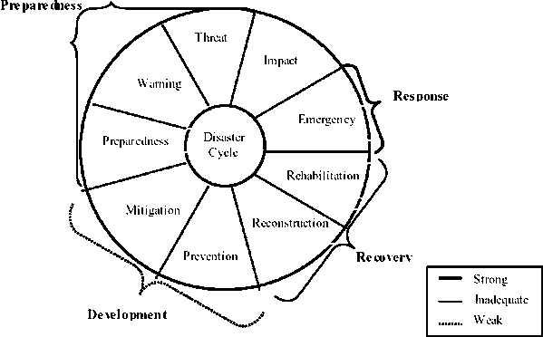 An assessment of local institutional responses to recent disasters was undertaken with reference to each major phase of the disaster management cycle. While detailed analysis is given in the succeeding paragraphs, the highlights of the assessment are shown in Figure 9. While local institutional response with regard to disaster preparedness is adequate to manage annual routine floods, these were inadequate in the event of severe floods like the November 1999 flood. Based on the experience of the 1999 flood, the local institutions could articulate the disaster prevention and mitigation strategies, which could reduce the impacts of floods. However, due to paucity of resources, the disaster mitigation and prevention measures are yet to be incorporated into development planning process at the local level.