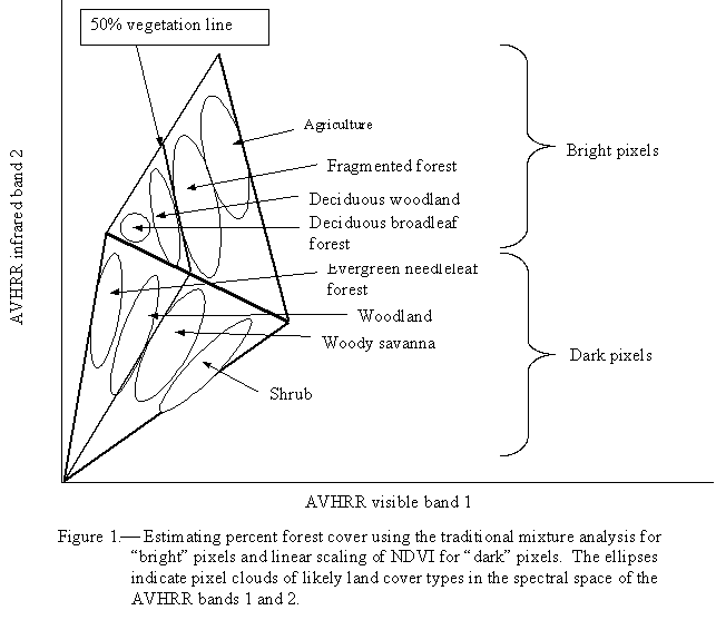 In the combined approach, the traditional unmixing method is modified slightly to apply only to bright pixels (pixels with high reflectance) in AVHRR bands 2 (infrared) and 1 (visible) spectral space. These bright pixels tend to be mixtures of forest (particularly deciduous forest), cropland, and bare soil having high reflectance in these bands. These cover types are treated as endmembers and the bright pixels are unmixed on each monthly AVHRR composite. Fraction classes range from closed forest to open forest, fragmented forest, and nonforest land cover. Dark pixels (low reflectance) in AVHRR bands 1 and 2, on the other hand, are generally found to be indicative of more undisturbed forests, particularly conifer forests. However these dense forests can be confused with low illumination or flooding. A scaled NDVI is a better indicator of forest density than mixture analysis for these dark pixels. Closed forests, open forest, and woody savanna are found to be closely related to decreasing NDVI, approximately between 0.8 and 0.3.