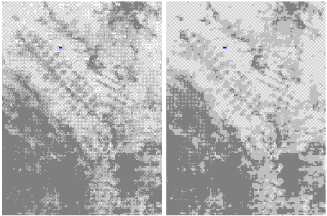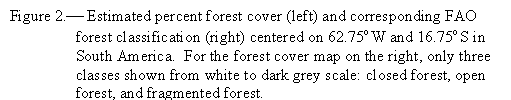 Early results have been obtained for continents of South America, Africa, and North America. For South America, for example, combined results from the two-step methodology produced a continental FAO forest cover map. Figure 2 shows an area in Bolivia, South America. The left image in the figure is estimated percent forest, the right image is derived FAO forest cover map (only three classes).