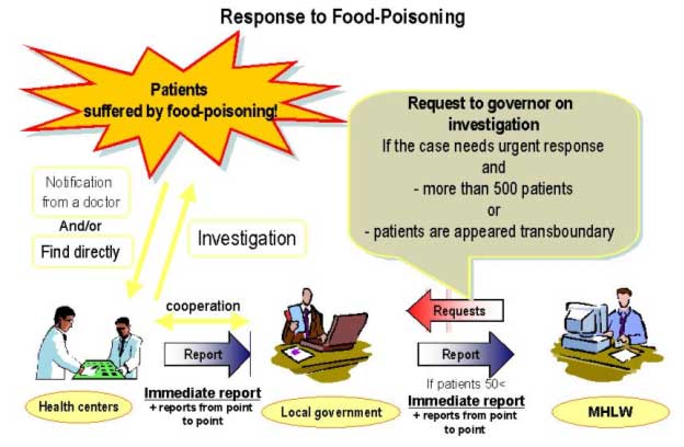 First, the doctor who diagnosed the patient suffered by a food poisoning is required to notify the Director of the nearest health center within 24 hours. When receiving the notification or otherwise knowing the occurrence of a food-poisoning case, the health center must concern epidemiology investigation about this case as quickly and report in writing to the food-safety departments of the local government. The food-safety departments of the local government must then report in writing to the MHLW. After this case was settled, the number of patients and deaths etc. are reported monthly to MHLW with online information distribution system (Wide-area Information-exchange System for Health, labour and welfare administration (WISH) system).