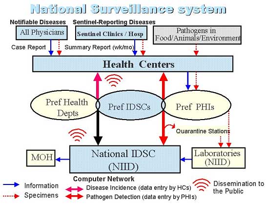 In the Infectious Diseases Control Law, all infectious diseases of new categories I through V are designated as the targets of The National Epidemiological Surveillance of Infectious Disease (NESID). All category I through IV infectious diseases and 14 kinds of category V diseases are required notifying all the cases. Those Infectious Diseases related to food (cholera, shigellosis, typhoid fever, and paratyphoid fever), patients, suspected cases, and asymptomatic carriers are the targets, and patients and asymptomatic carriers of enterohemorrhagic Escherichia coli infection of category III are the targets. As same as the surveillance of food poisoning, the doctor who diagnosed the infectious disease is required to notify the director of the nearest health center within 24 hours. When receiving the notification or otherwise knowing the occurrence of the infectious disease case, the health center must concern epidemiology investigation about this case as quickly and report in writing to the health departments of the local government. Upon receiving the patient information from a health center, the health departments of the local government must send the information to the national infectious disease surveillance center* through the computer-network system. (*: The national infectious disease surveillance center has been organized in order to play a central role in the national surveillance. The Infectious Disease Surveillance Center (IDSC) of the National Institute of Infectious Diseases (NIID) fulfils this function and is also the contact point of WHO Global Alert and Response Network (GOARAN).)