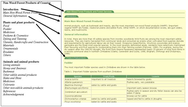 Following figure is the layout of the description part of Non-Wood Forest Products of a country in web site (in this case Zimbabwe). A content of pages is usually plain text and can contain also tables. Headers of different levels are separated with colours, font size and font type (see arrows on the following figure).