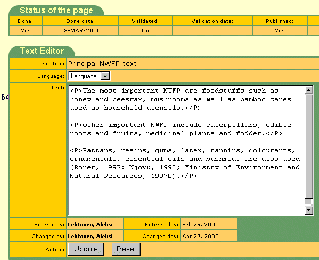 The texts are stored into database in a simple HTML format (see previous figure). Simple HTML means a format that has as less tags as possible. In the table below there is a NWFP text that has been saved into database. In this case, database texts has only very few tags. Paragraphs have been separated by using tags. In this example all the other formatting information is not needed (for example font, alignment, etc.).