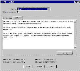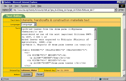 There is two ways to put texts into database, these are Foracle and web browser. Foracle is an Oracle based database tool that allows data entry by several users at the same time. Texts are stored into database in a simple HTML format (see following figure). Foracle can be used in Fao headquarters, but web browser can be used in any place if there is Internet access. For example Geneva office and Fao representatives will use web browser for text entry and for correcting possible mistakes.