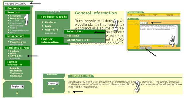 The data entry with using web browser is possible for texts, but not for numeric data (forest cover data and etc.). Using web browser for text entry can be done using any machine that has access to Internet. After logging to the system you have to select correct topic from the menu (for example > NWFP > Description, phases 1 and 2) and after this you have to select country or geographical area you are working with. See the instructions below the following figure.