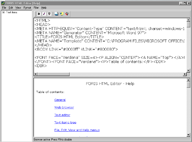 The WebEdit program has been developed to support the HTML editing without having to by expensive software and it is specially written to facilitate editing needed for FRA purposes. Documents saved in HTML format using, e.g., MS Word can be opened in WebEdit.