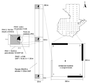 In each tract four sample plots (250x20 m2) are distributed and laid out in directions south-north, west-east, north-south and east-west according to the FAO/FRA standard nfa design. Some parameters are measured only in sub-plots to lower the work-load. The national design of the Guatemalan nfa includes two additional sub-plots to the FAO/FRA standard design; “PAN 3” and “PAN 4”. PAN 3 represents the left half of the sub-plot level 1 (PAN 1) and here bayal and mimbre are measured. PAN 4 represents the upper left quarter of the sub-plot level 2 (PAN 2) and here xate is measured.