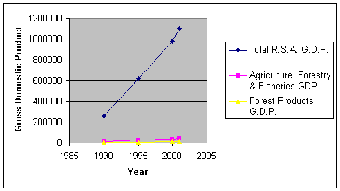 The value of forest good and service grew by R514 million per annum (15%) from 1990 t0 2002 and trade balance by R2 534 annually (20%) from 1992 to 2002. This can be attributed to the depreciation of the currency since 1995. Forestry contribution to agricultural and manufacturing increased annually by 3.1% and 0.7% respectively from 1992 to 2002. However, the value of forest product as a percentage of the National GDP declined annually by 0.4% over the same period.