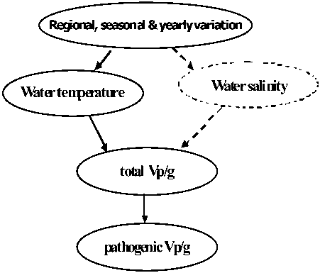 The exposure assessment for V. parahaemolyticus in raw finfish quoted models for the effect of temperature and salinity on the concentration of V. parahaemolyticus in raw oysters. The output from the present model should be compared to that of the Japanese models quoted in the finfish section. It should be determined whether the Japanese models have been subjected to validation. The latter models included a concentration factor relating the concentration of V. parahaemolyticus in seawater and oysters - caution was urged regarding this as such concentration factors were known to vary greatly for other bacteria with regard to both shellfish species and temperature.