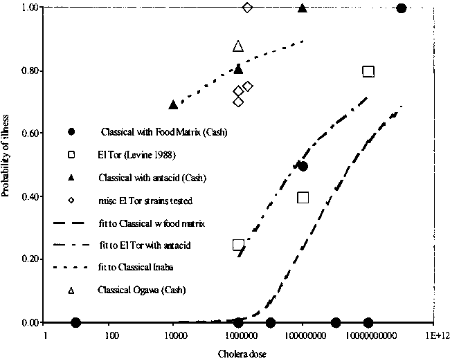 La figure 6.2 montre les concordances les plus probables des données relatives aux volontaires humains pour plusieurs biotypes et sérotypes de V. cholerae. De nouveau, l'incertitude est représentée par une famille de courbes entourant chacune des courbes les plus probables, mais ceci n'est pas montré. Le point extrême modélisé est la maladie gastro-intestinale. Les données indiquent que la consommation de V. cholerae par des aliments peut déplacer de manière significative la courbe dose-réponse vers la droite, indiquant qu'une dose supérieure de V. cholerae est nécessaire pour causer la maladie dans un nombre comparable de volontaires lorsque les bactéries V. cholerae sont consommées par des aliments. On ne sait pas si des matrices alimentaires spécifiques ont des effets plus ou moins importants sur le déplacement de la relation dose-réponse.