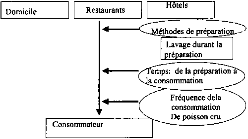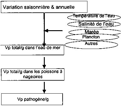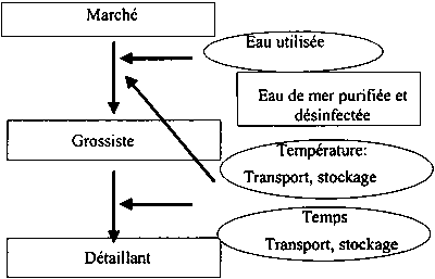 · Il a été montré que l'eau de mer côtière utilisée à l'arrivage et sur le marché était fortement contaminée par V. parahaemolyticus et cette phase peut représenter un facteur de risque important pour la contamination.
