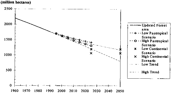 Figure 10. Declining natural forest area in tropical Africa 1960- 2050. In the scenarios until 2050 the solid lines indicate low and high trend scenarios and the squares with broken lines low and high regression model-based scenarios (Palo and Lehto 2003b)