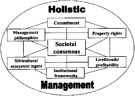 The model stresses the importance of inter-relationships between and among a range of components - commitment, resource security, attention to improving livelihoods for local people and/or profitatility, sound institutional and management frameworks, attention to silviculture and ecosystem management, and application of sensible management philosophies. The core of the model is anchored on reaching societal consensus with regard to how forests should be managed and what we want from forestry. Overarching the model is a holistic approach to management that recognizes the roles of the forest within broader ecological, economic and socio-cultural systems.