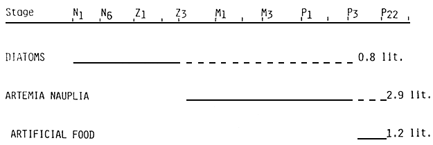 The larvae and post-larvae feeding is a basic aspect of the hatchery production. Table 25 shows general sequence scheme of foods supplied in Penaeid culture all over the world.