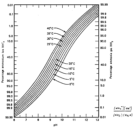 Effects of pH and temperature on the distribution of ammonia and ammonium ion in water. Data from LIAO et al. (1972)