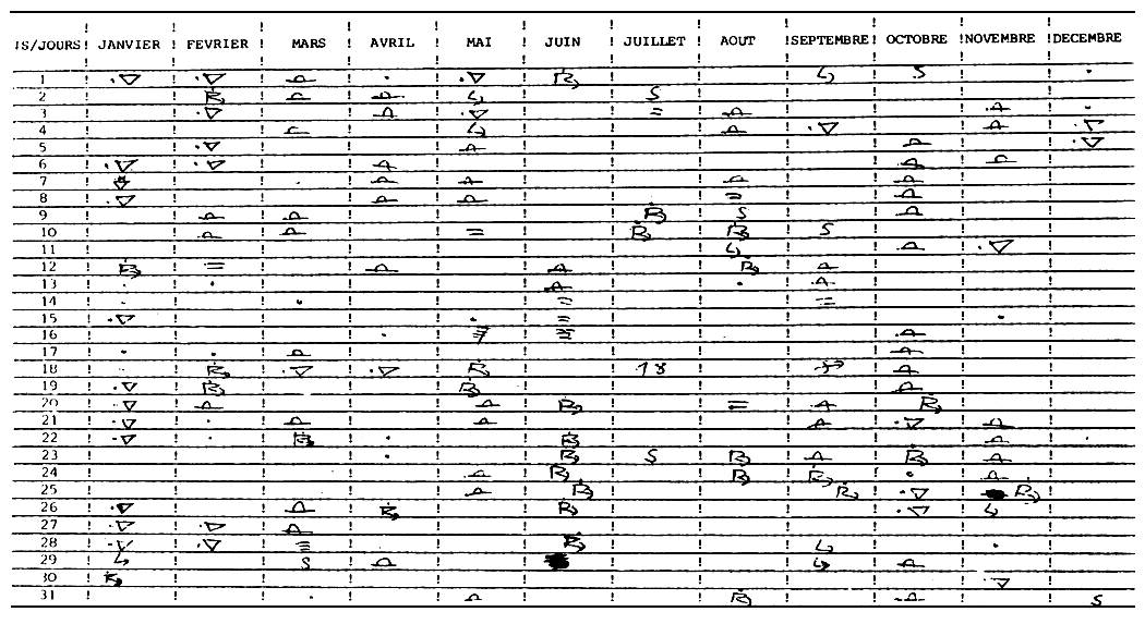 | MOIS/JOURS | JANVIER | FEVRIER | MARS | AVRIL | MAI | JUIN | JUILLET | AOUT | SEPTEMBRE | OCTOBRE | NOVEMBRE | DECEMBRE |