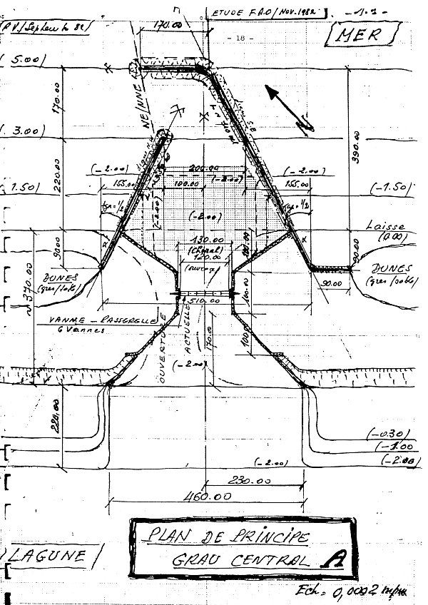 Le sous-dossier B qui accompagne le présente Notice contient sous № 3 le fond de plan bathymétrique dressé à la suite d'un lever effectué en juin 1983 sur lequel ont été portées les dispositions proposées pour les ouvrages de protection de l'ouverture tels prévus par le PROJET D'EXECUTION évoqué au paragraphe 3 ci dessus.