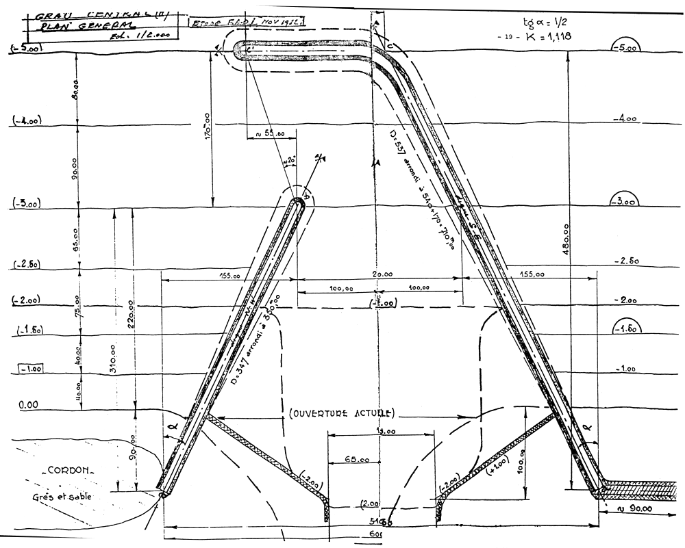 Les longueurs adoptées découlent de la position des isobathes relevées par lever bathymétrique réalisé en juin 1983 et sur lequel apparaît un remaniement important des petits fonds devant l'ouverture existante comportant :