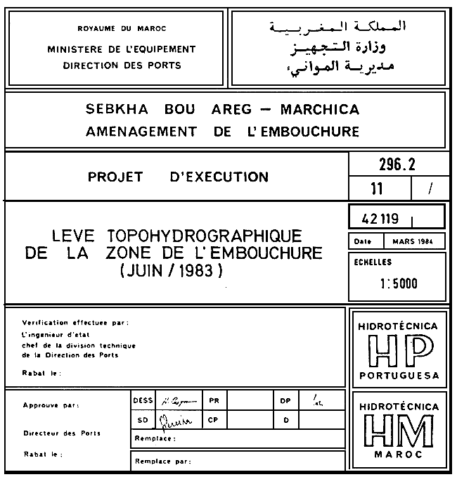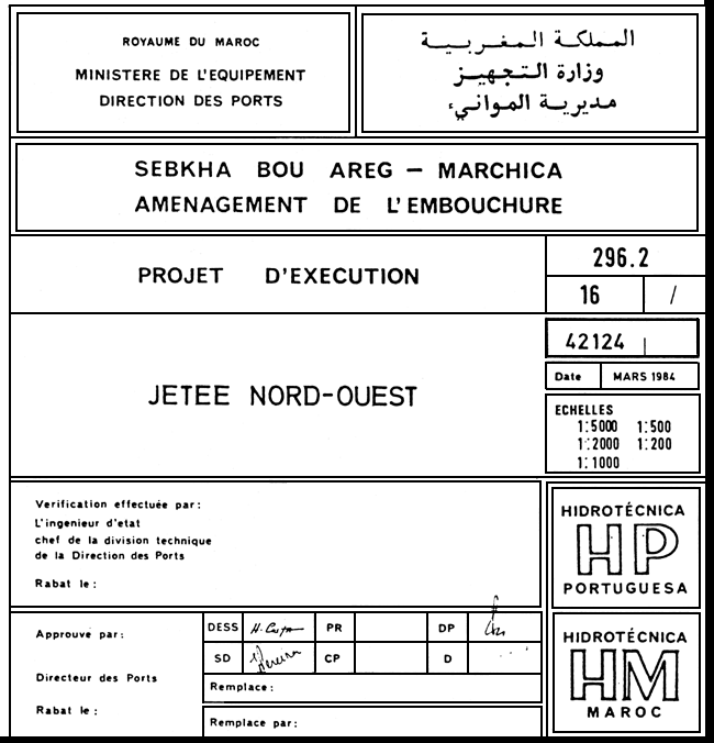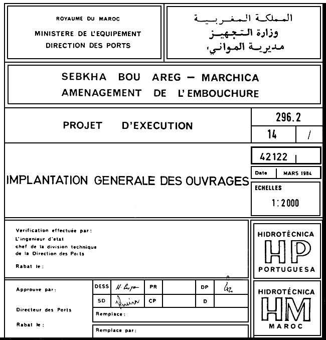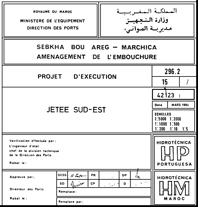 - ultérieurement, par un AVANT PROJET DETAILLE (A.P.D) en date d'août 1983, puis par un PROJET D'EXECUTION (P. Ex) en date de mars 1984, tous deux établis par le Bureau d'études - LABORATORIE D'HYDRAULIQUE : HIDROTECNICA PORTUGUESA représenté au Maroc par le Bureau d'Etudes HIDROTECNICA - MAROC.