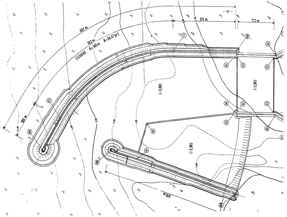 - une digue Nord-Ouest d'environ 360 mètres de longueur atteignant l'isobathe (- 2,00) actuelle, voisine de l'isobathe (- 3,00) primitive, identique (à 10 mètres de longueur près) à la digue du PROJET D'EXECUTION,