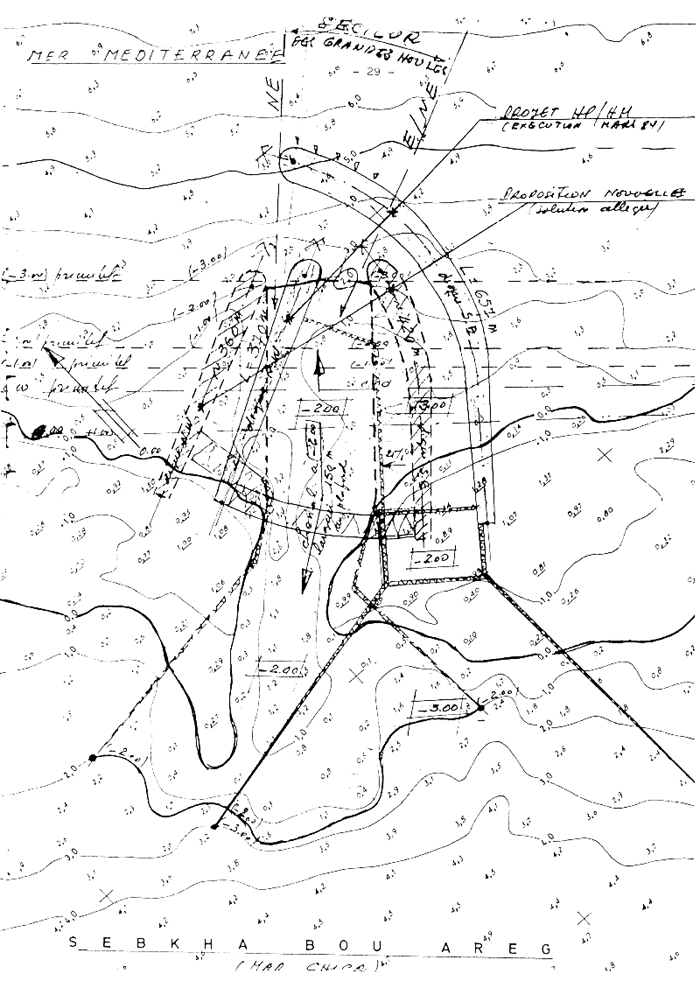 Enfin des précautions sont à prendre pour asseoir les digues et plus particulièrement le digue Nord-Est à établir en aval du transit littoral sédimentologique pour tenir compte de la rectification prévisible des isobathes de (-1,00) à (-3,00) évoquée ci-dessus, rectification qui va se traduire par un approfondissement des fonds à proximité des digues, côté extérieur après établissement des ouvrages.