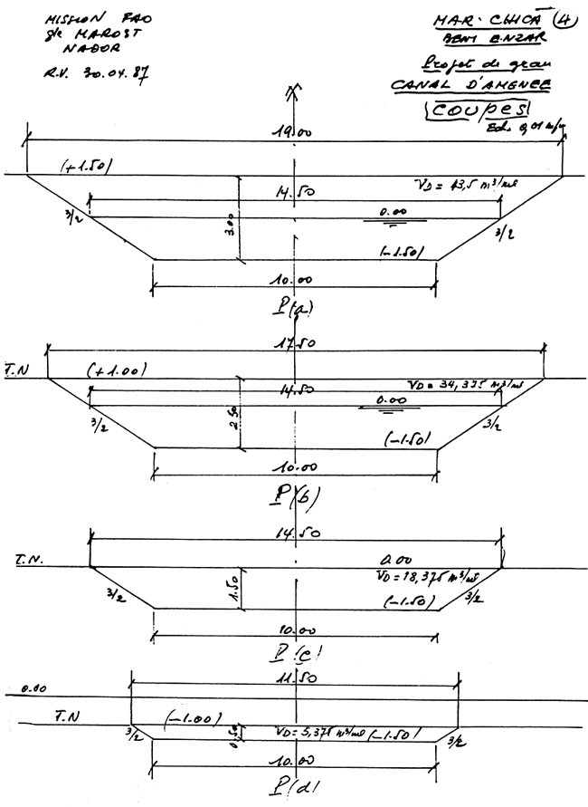 Le dessin № 4 de l'A.P.S. présente les coupes transversales du canal qui précisent les caractéristiques de l'ouvrage ainsi que les volumes de déblais à extraire à l'aplomb de chaque profil particulier repéré sur le PLAN D'ENSEMBLE (dessin № 1).