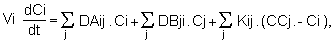 Vi est le volume de la boîte i, A désigne la quantité de la substance quitant la boîte i sous la condition que Dij soit négatif, et B la quantité entrant dans cette même boîte si Dij est positif. Le dernier terme C de l'équation traduit les échanges dispersifs dont le sens est fonction du gradient de concentration entre les boîtes adjacentes.