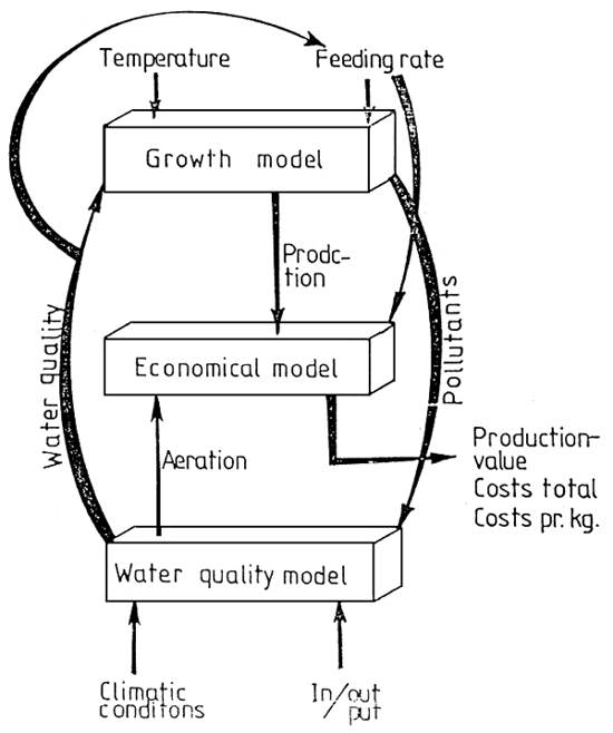 the first model relates growth rate of the cultivated aquatic organisms with the forcing functions, i.e. the temperature and the feeding rate, the latter being controlled by man. The utilization of the food and the growth rate are known from the literature. The amount of pollutants coming from the aquaculture is also a part of this submodel, i.e. the amount of ammonia excreted and the amount of faeces and undigested feed. This information is used in submodel 3. The water quality influences also the growth of the fish; this is the results of submodel 3. The interrelations of the 3 submodels are shown in fig. 1;