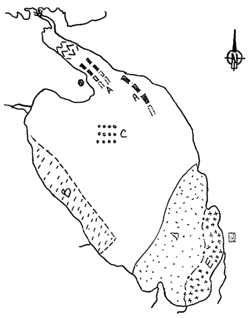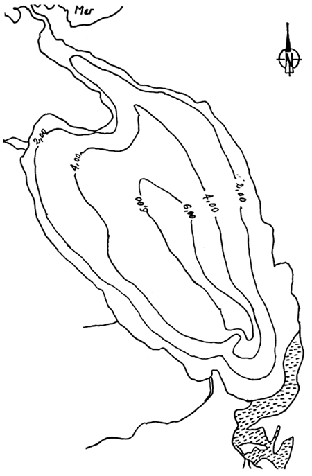 Quant au plan d'eau, la bathymétrie présente un profit décroissant des berges jusqu'aux zones centrales du lac. Les plus grandes profondeurs se situent autour de 6 mètres avec une grande superficie de l'ordre de 60% de la totalité, ayant des profondeurs >- 4 mètres. Le substrat du lac est recouvert d'une boue plus ou moins sableuse ou argileuse, elle-même surmontée d'une épaisseur de vase, présentant une grande zone centrale caractérisée par des boues riches en substances organiques et pauvre en oxygène.