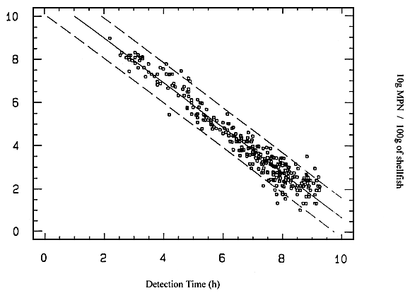 where (E. coli) is the most probable number of E. coli in 100g of meat and shell liquor and DT the detection time expressed in hours. The absolute value of the correlation coefficient (r) is 0.968.