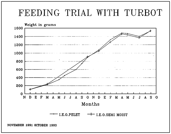 The extruded diet (54% protein/17% fat) gave better results than the pellet diet, especially in turbot weight from 400 grs.
