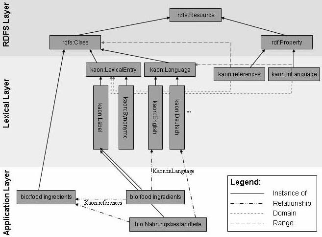 Figure 2 gives an overview of the above-discussed layered modelling approach in RDFS. The top layer represents an extract of the basic layer provided by the RDFS language. The lexical layer creates the needed abstraction of lexical and language representation from conceptual domain semantics. The lowest layer finally constitutes the domain. The most generic class in RDFS is rdfs:Resource[5], from which every other class is derived An rdfs: Class can be instantiated to define domain specific concepts. Lexical Entries are separate classes which can be instantiated and attached to concepts using the properties kaon:references and kaon:inLanguage. Each property has a domain and a range, which determine the source and the target of the relationship respectively. In that way, an infinite number of lexical entries can be instantiated and related to domain concepts and different languages. If a representation of a concept in terms of its lexical entry changes, the semantics of the ontology are not affected, since it still refers to the same concept. Furthermore, additional domain properties can be derived from rdf:Property in the application layer to relate the domain concepts and build the semantic network.