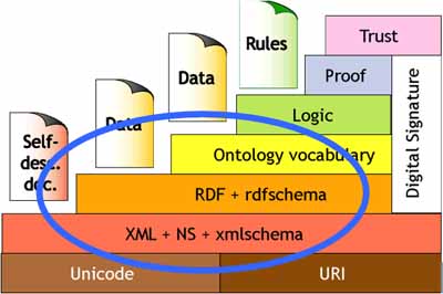 In his vision of the Semantic Web, Tim Berners-Lee (Berners-Lee 2000) outlines an architecture for the Web that is multi-layered and machine processable, as depicted in the much-reproduced image in Figure 1. The layers with which we will principally be concerned are the resource description framework layer and the ontology layer. The XML layer will be touched upon insofar as it addresses the issue of content.