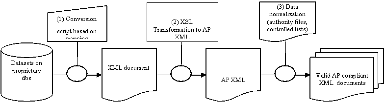 The first step (1) involves mapping the local data model to the AP, and then either creation of a conversion script or direct export of data into XML (as allowed by some databases). In the next step (2), XSLT is applied to convert the simple XML document into the AP compliant XML format. In the case of native XML database this step might not take place. The last step (3) comprises data normalization, which ensures not only that the XML file validates correctly against the EEAP DTD but also that all the requirements, such as use of controlled vocabularies or declaration of used schemes, are met.