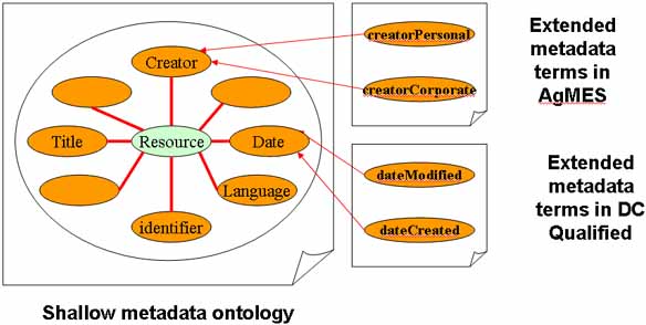 However, the ontology can be further extended beyond basic bibliographical metadata. On the one hand, subtypes of concepts already existing in the root ontology can be added. For instance, the dc:creator concept subsumes the sub-concept ags:creatorPersonal[10], from which more specific concepts such as main author and alternate author can be derived. On the other hand, the root ontology can also be extended through the incorporation of controlled vocabularies. These vocabularies may simply consist of a flat list of terms, such as language codes. When the controlled vocabulary has some explicit semantics, as does a thesaurus, it lends itself to realization as a sub-ontology. These extension types are elaborated in the next two sections.