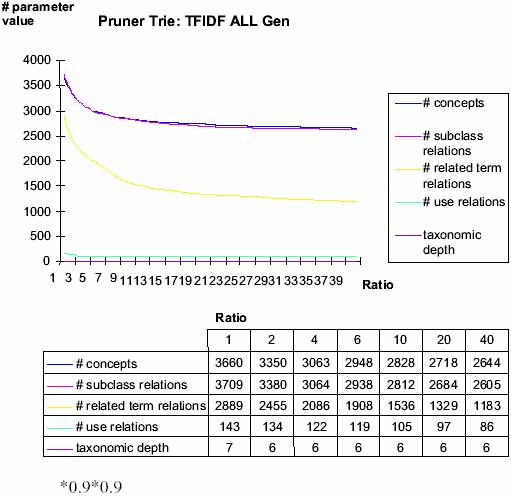 The pruned ontology with the highest number of concepts has been chosen for empirical assessment and evaluation by subject specialists. Subject specialists deleted all concepts in the pruned ontology that were not relevant for the domain. This evaluated ontology has been used as the gold-standard ontology. All other pruned ontologies have been compared with it testing the effects of different parameter settings on the filtering of relevant and more specific concepts.